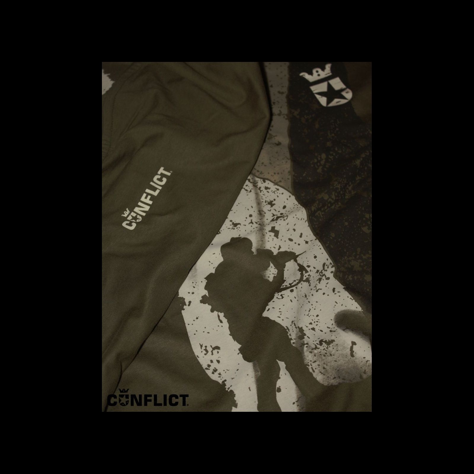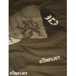 - On the back, the entire Conflict logo is slightly above the shoulder blades - towards the neck.