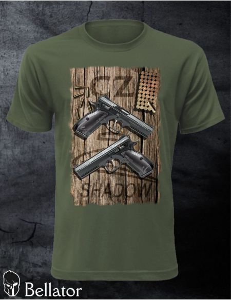- The main motif of the t-shirt consists of two images of this weapon, cartridges and the inscription "CZ Shadow 2", on the back above the shoulder blades the Bellator logo.