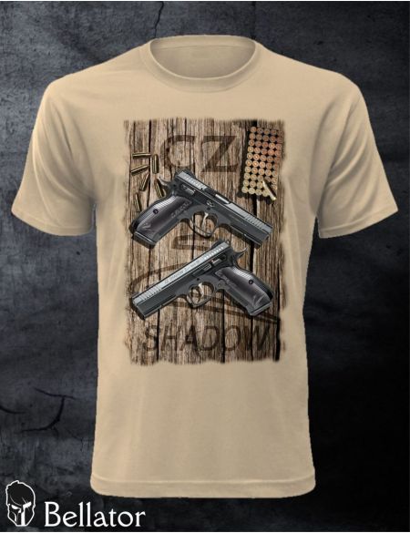 - The main motif of the t-shirt consists of two images of this weapon, cartridges and the inscription "CZ Shadow 2", on the back above the shoulder blades the Bellator logo.