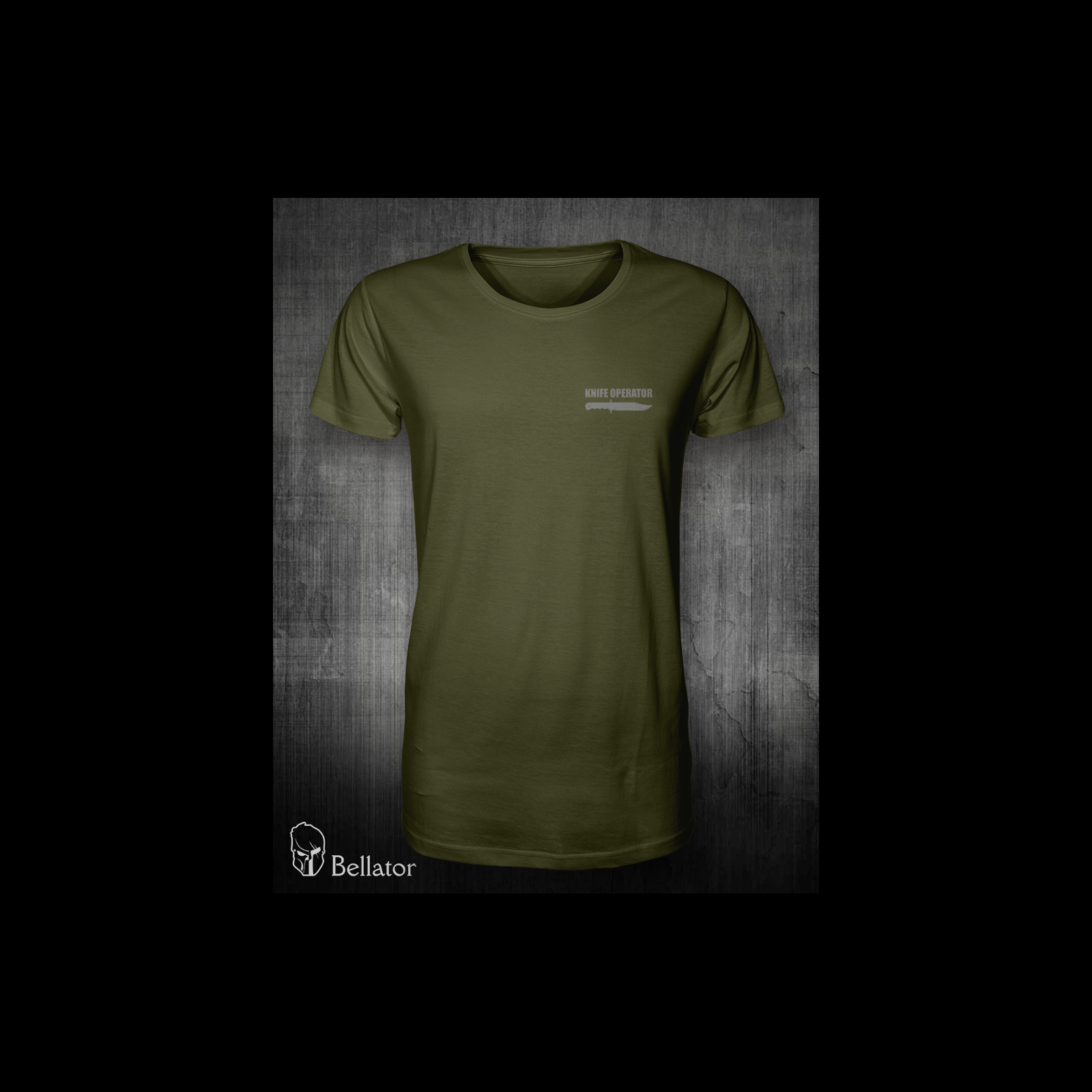 - A knife is depicted on the left breast in front. The main motif of the knife is located on the back along with the inscription OPERATOR.