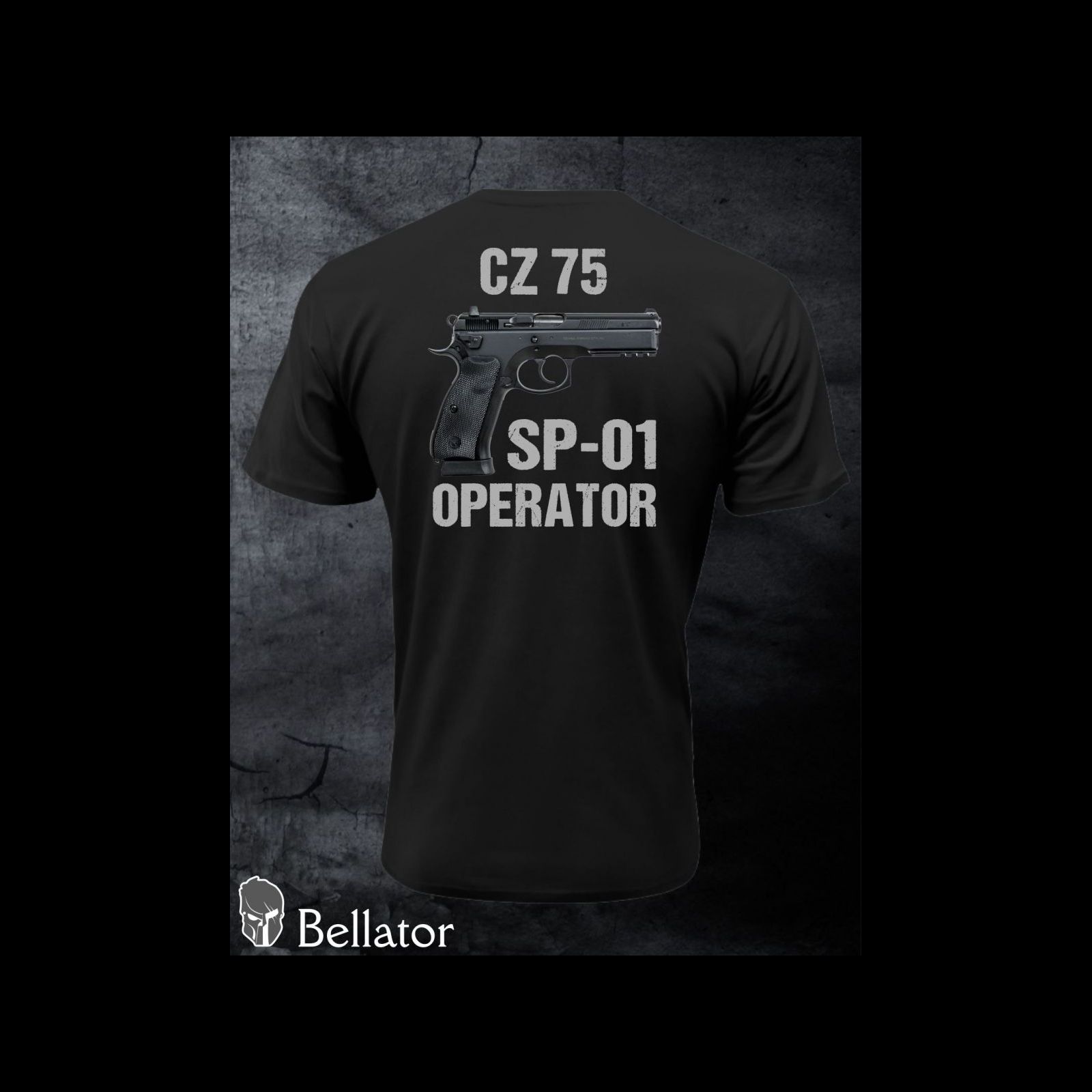 - The CZ 75 SP-01 weapon is depicted on the front on the left breast. The main motif of the weapon is located on the back along with the inscription OPERATOR.